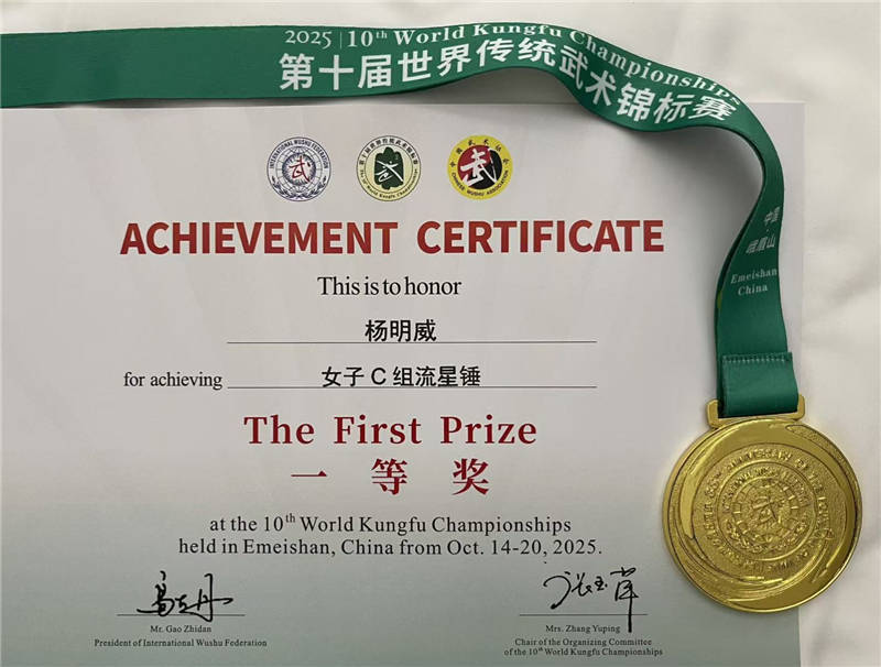 杨明威 ,女 ,毕业于泰山学院附属中学,现在读大学三年级,出身武术世家,武术国家一级运动员。2025年5月25号,其在全国传统武术公开赛螳螂拳比赛中荣获金牌。本届世界传统武术锦标赛,有来自54个国家和国内的5000多名运动员参赛。