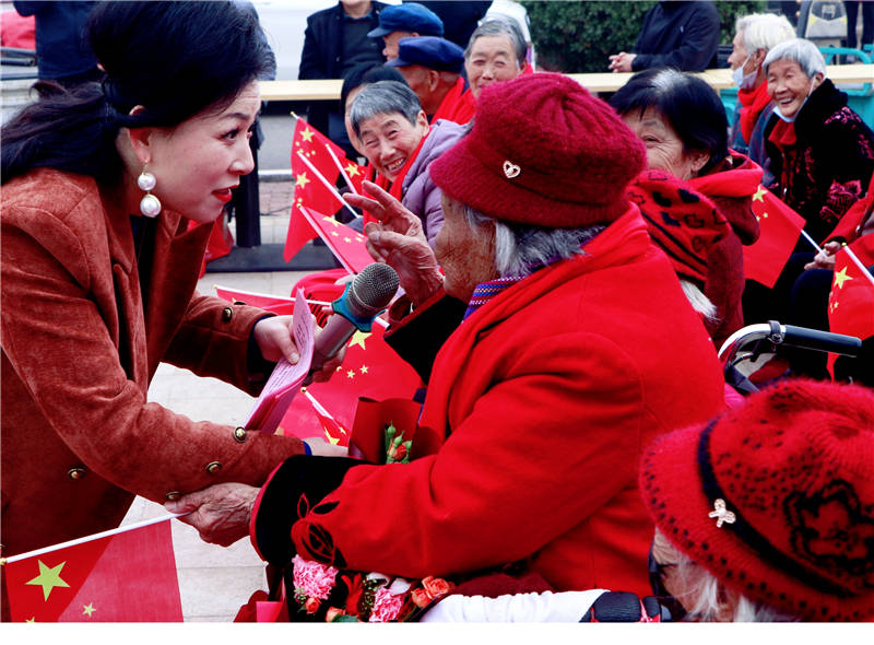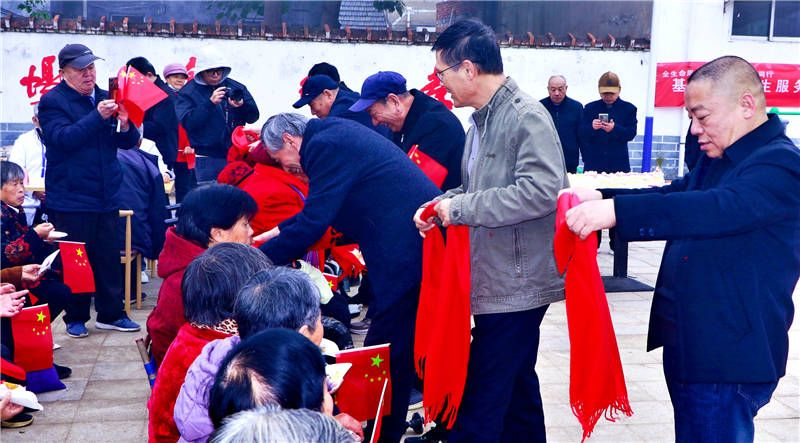 生日会过后,县老领导们为90岁以上高龄老人戴上红围巾,递上鲜花与慰问品。红色围巾映着老人们欣慰的笑容,亲切问候与真挚祝福交织,将党和政府及社会各界的关怀精准传递到老人心中,现场致谢声与欢笑声此起彼伏。