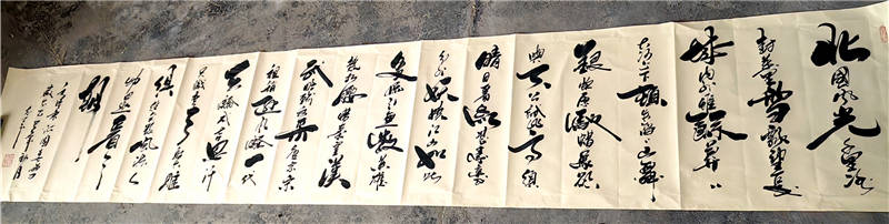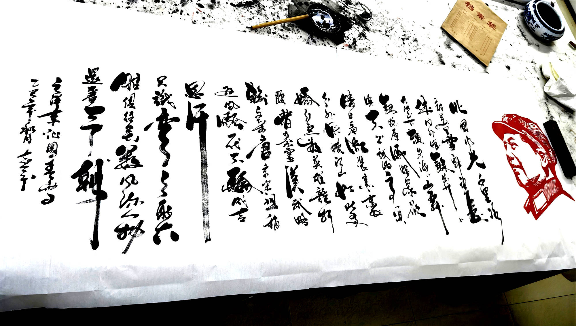 张总监此作,以笔墨为舟楫,渡我们穿越历史烟云,再临那个风云激荡的年代。整幅作品布局如兵家布阵,疏密有致,开合之间尽显恢弘气象。笔力遒劲处似北国冰封之峭崖,流转处若大河奔涌之波涛,将毛主席词中“千里冰封,万里雪飘”的壮阔意境与“欲与天公试比高”的豪迈气魄演绎得淋漓尽致。