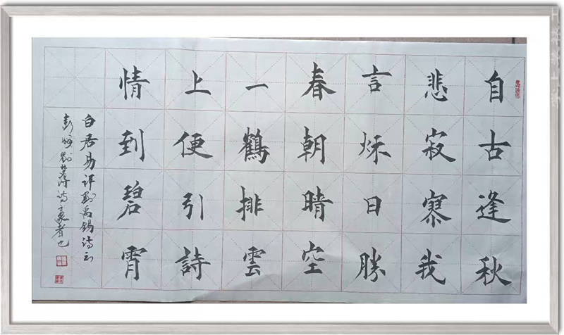 自幼受父亲熏陶,张建国先生对书法艺术便情有独钟,这份热爱矢志弥坚,贯穿半生。“常思书艺千秋事,只求书艺精”,是他的艺术追求,更是日常修行的真实写照。为探寻书法真谛,他苦读中国书法史,溯源文脉流变;苦练历代名帖,博采众长而成己格。从隶书经典《石门颂》的雄浑恣肆、《礼器碑》的庄重典雅、《曹全碑》的秀逸灵动,到近代书法大家刘炳森的笔墨神韵,他逐碑临摹、反复揣摩,在碑帖交融中夯实根基。后痴迷楷书欧体《九成宫碑》,沉醉于其严谨的结体、刚劲的笔法,数十载临池不辍,笔耕不怠,终得欧体精髓,形成兼具传统法度与个人气质的书法风格——其字结构规整、笔力遒劲,于端庄中见灵动,于沉稳中藏气韵。
