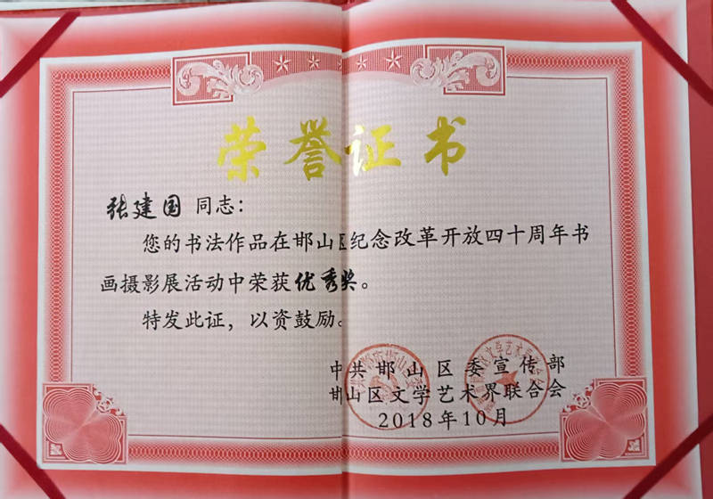 数十年的潜心耕耘,换来了累累硕果。张建国先生的书法作品因其深厚的艺术功底与独特的审美价值,在各类赛事中屡获殊荣:多次斩获邯郸市书法比赛重要奖项,在全国性赛事中更是大放异彩——荣获第二届全国精品书法大赛银奖、中国老年书画家协会书画报首届全国比赛铜奖、第六届三十省区市中老年书画联合大赛优秀奖、第五届书画大赛暨第二届全国毛体书法大赛佳作奖、第四届全国老年书画大赛王羲之书画奖风尚奖等诸多荣誉。每一份奖项,都是对他书法造诣的高度认可,更是对其执着坚守的最好褒奖。