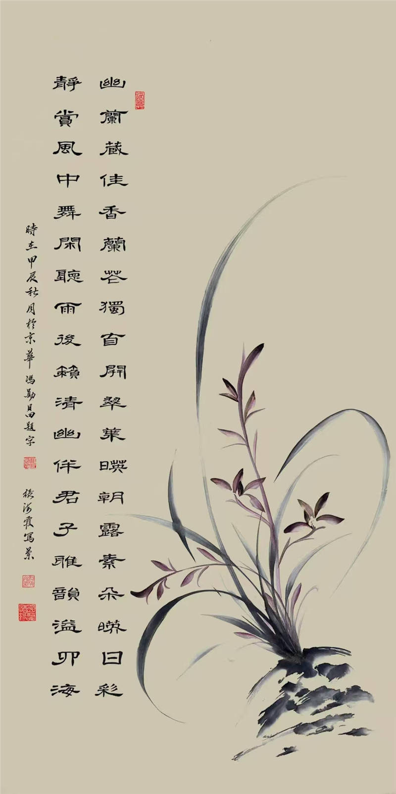 墨香与兰香交织,画笔与光阴对话——这一幕,仿佛她人生的浓缩:艺术、孝道、传承,在宁静中蕴藏着坚韧的力量。兰生幽谷:艺术的根扎在艺术土壤。“我画的不是兰,是魂。”张海霞放下画笔,指尖还沾着淡淡的石青。作为蜚声内外的“兰”画派传承人,她却始终认为,自己最珍贵的身份是“文化的描摹者”。张海霞的创作脉络,深深植根于传统文化。“很多人问我,为什么我的兰既有传统笔墨,又有一股凛然之气?因为我在画兰时,心中想的是那些像兰一样坚韧的人。”她展开一幅近年作品《幽兰》:嶙峋山石间,兰叶如剑,兰花如星,画面一角淡赭轻染,似朝霞又似烽烟。