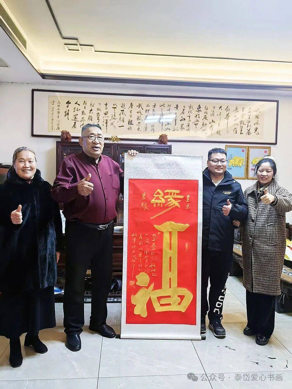 交流活动在公司文化大厅拉开序幕。张范义院长率先提笔,饱蘸浓墨,“稳如泰山”四个大字力透纸背,笔势雄浑中透着沉稳,既彰显了企业经营的核心理念,又展现了书法艺术的刚劲之美。 “鸿福齐天”四字以金色挥就,笔力雄浑如泰山稳立,配着鲜红底色,似有霞光流转,满溢喜庆;“鱼水情缘”绘锦鲤游弋碧波,鳞光闪闪间透着和谐暖意;《礼佛图》中,佛与僧完美地组合成了佛字,瑞气盈盈。这些作品皆以金墨点睛、红宣为底,每一笔都藏着吉祥如意的祝福,看在眼里,暖在心头,为现场添了浓浓的欢喜氛围。张明国董事长捧着墨香未干的作品说:“这些书画不仅是珍贵的藏品,更是我们企业文化建设的宝贵财富,将激励我们更好地扎根梨乡、服务社会。”