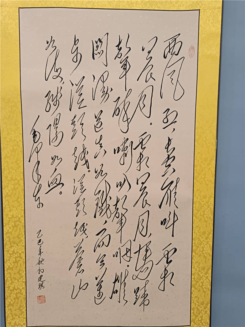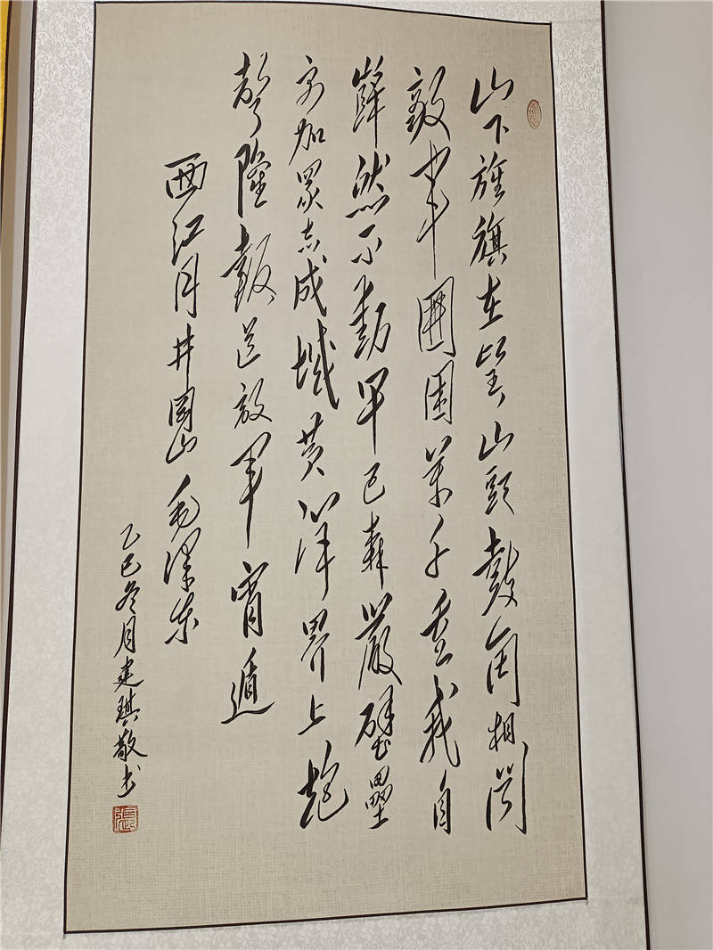 本次活动以书法艺术为纽带,缅怀伟人功绩,传承红色文化,吸引了社会各界广泛关注。 展览现场墨香悠远,氛围庄重而热烈。五十余幅作品精心陈列,既有毛泽东诗词名篇的恢弘再现,也有其经典语录的笔墨凝聚。张建琪老师多年来潜心研习毛体书法,其作品笔力遒劲、气势雄浑,既保留了毛体特有的豪迈与飘逸,又融入了个人对伟人精神的理解与致敬,展现出深厚的艺术功底与情感投入。